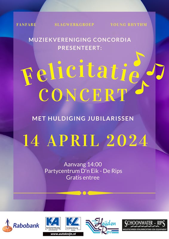 Op 14 april 2024 zal Muziekvereniging Concordia De Rips wederom een Felicitatieconcert organiseren. Dit is een jaarlijks terugkerend concert in de lente waar alle jubilarissen van De Rips in het zonnetje worden gezet.