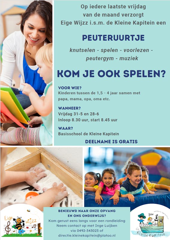 Op iedere laatste vrijdag van de maand verzorgt Kinderopvang Eige Wijzz in samenwerking met de Kleine Kapitein het peuteruurtje. De variatie aan activiteiten zoals knutselen, samen vrij spelen peutergym, samen muziek maken of voorlezen, belooft veel plezier!