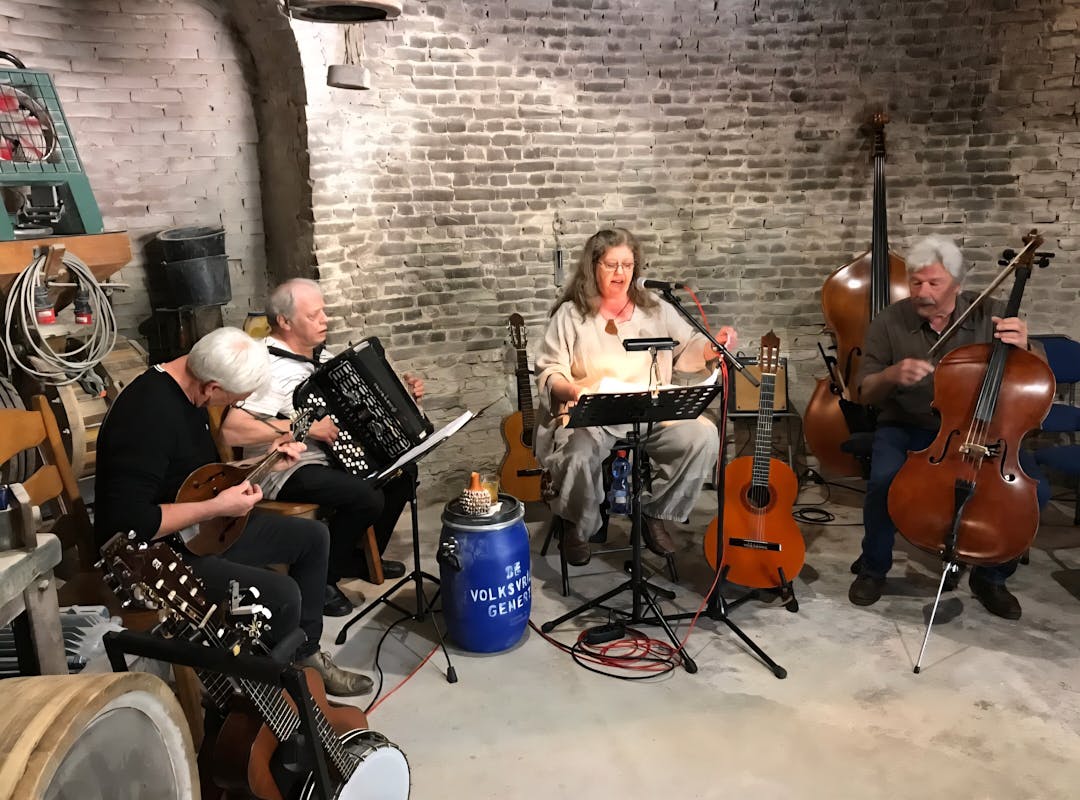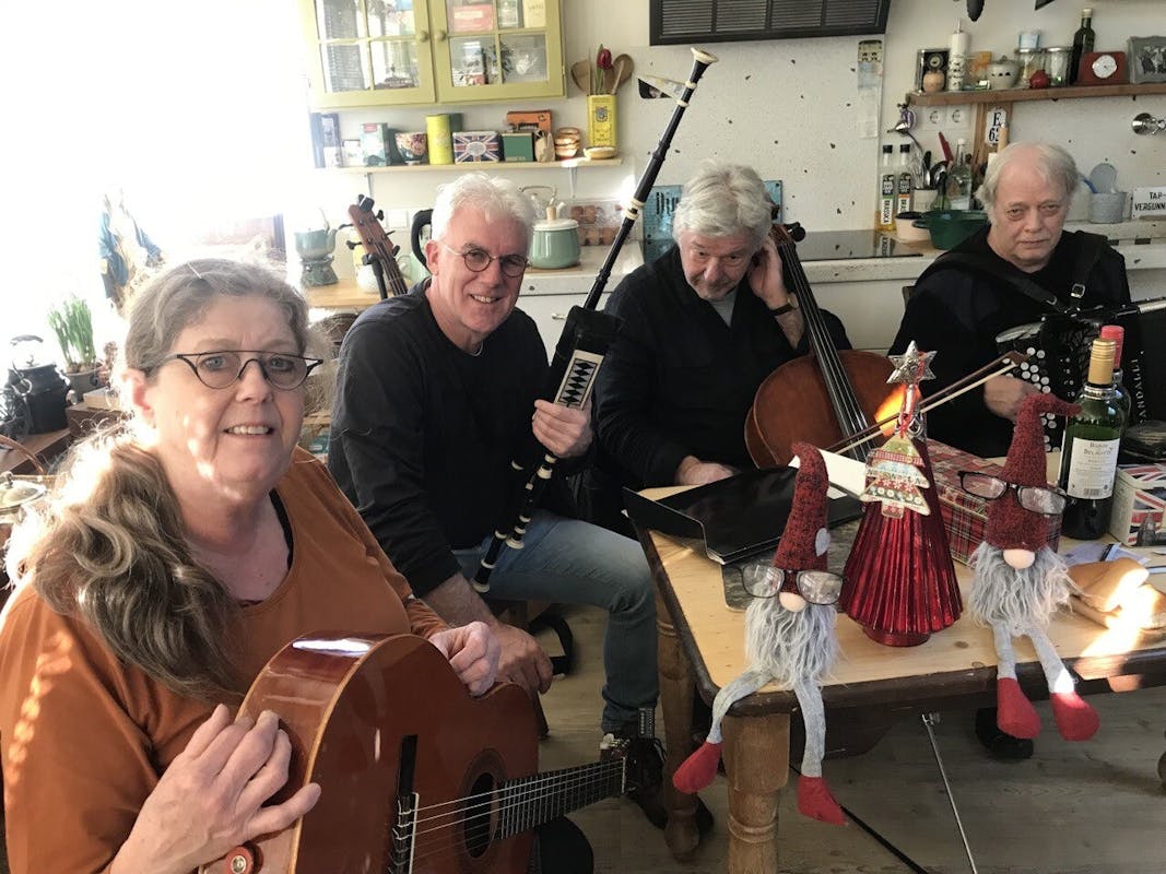 Ze wordt begeleid door heur 4 Apostelen o.a. met mandoline, gitaar, cello, accordeon, doedelzak en mondharmonica. Troubadeuze Ger heeft al diverse cd's/lp uitgebracht.