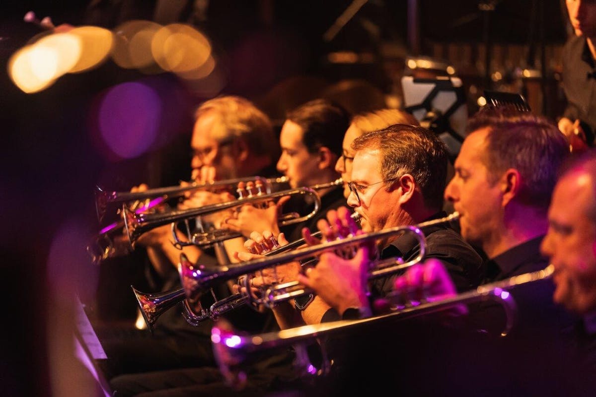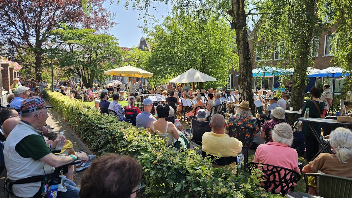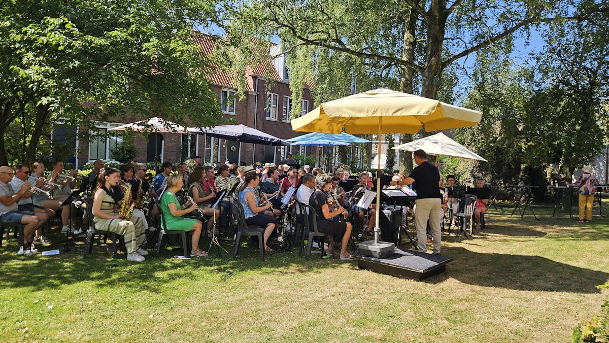 Gezamenlijk optreden van Harmonie Excelsior met het Jachthoorn en Trompetterkorps. In de Tuin van Hof van Nazareth.