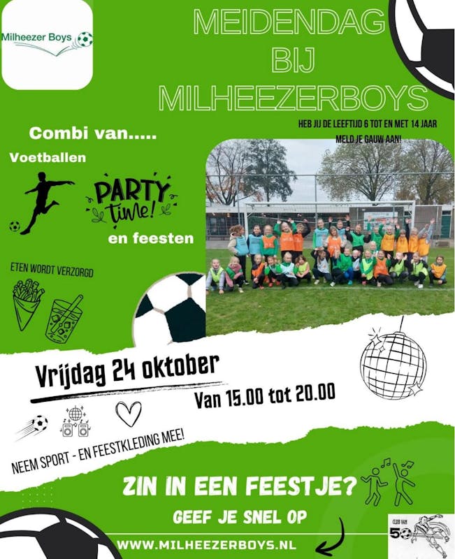 Na het succes van vorig jaar organiseren we ook dit seizoen weer een Meidendag bij Milheezer Boys! Op vrijdag 24 oktober 2025 verandert ons sportpark opnieuw in ππͺππ©π¦π¦π»π¦π³ ππͺπ³ππ΄ π€