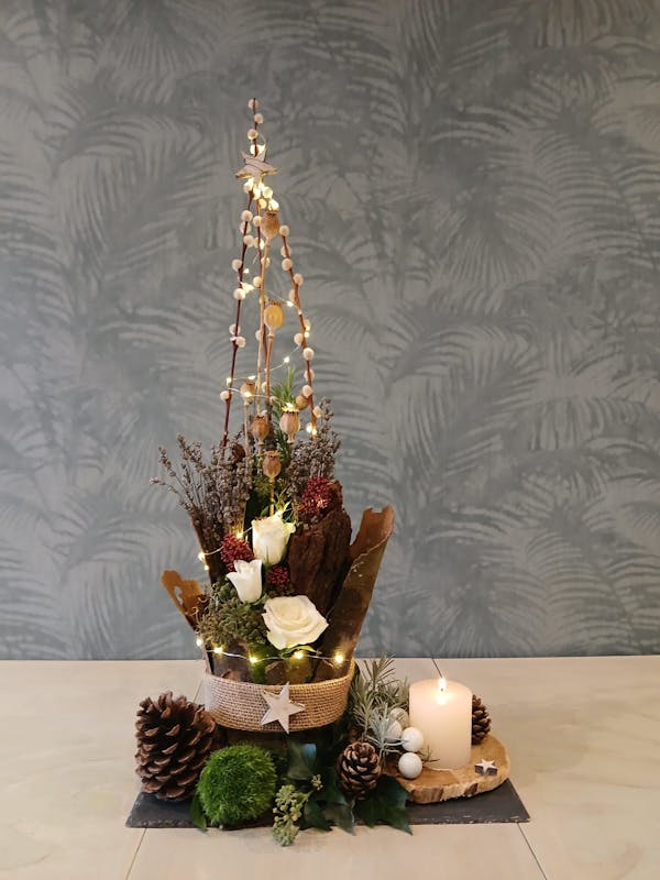 Decoratief kerstbloemstuk met natuurlijke materialen
