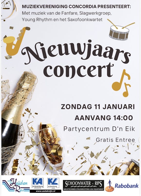 Muziekvereniging Concordia De Rips, bestaande uit Fanfare, Slagwerkgroep, jeugdorkest Young Rhythm en Joekskapel Bènde Betoetert?. Repeti......