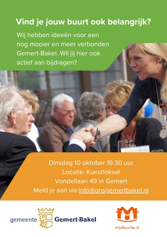 Meer weten? Kom dan naar de informatieavond! Zou je meer met mensen in je omgeving, dorpskern of wijk willen delen of voel je dat er veel meer uit uw buurt, dorpskern of gemeente te halen is? We zoeken enthousiaste inwoners die samen met de gemeente de schouders onder het digitale community platform willen zetten. Wil je je graag inzetten voor je buurt? Dan is de rol van buurtverbinder mogelijk iets voor jou! Tijdens de informatieavond op 10 oktober om 19.30 uur, hoor je wat dit inhoudt. Neem gerust buren, familie en/of vrienden mee. De bijeenkomst is in het Kunstlokaal in Gemert en duurt tot 21.30 uur. Fijn als u laat weten als u komt, dan houden wij daar rekening mee. Stuur een e-mail via .