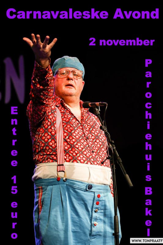 CARNAVALESKE AVOND. Een avond met een lach. Gepresenteerd door Hans Verbaarschot. De artiesten zijn: René van Boxtel, Joran Manders, Hans Keeris, Rob van Elst en Hans Ver...