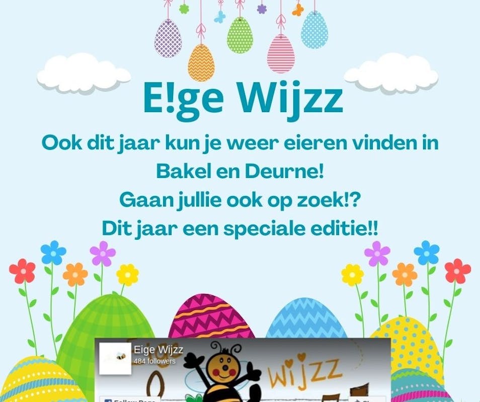 Elk jaar organiseert Eige Wijzz een evenement wat E!ge Wijzz wordt genoemd. We verstoppen in Bakel en Deurne eieren met ons logo erop en een QR code op de achterkant. Deze eieren mogen dan weer ingeleverd worden bij één van de vestigingen van Eige Wijzz. Wanneer je deze in kan leveren kun je vinden aan de hand van de QR code op de achterkant van het ei. In Bakel doen we dit in samenwerking met OBS De Kleine Kapitein! Dus ook hun logo is de vinden op het ei! Iedereen in de leeftijd van 2 t/m 12 jaar mag meedoen aan de zoektocht! Doe jij ook mee?!