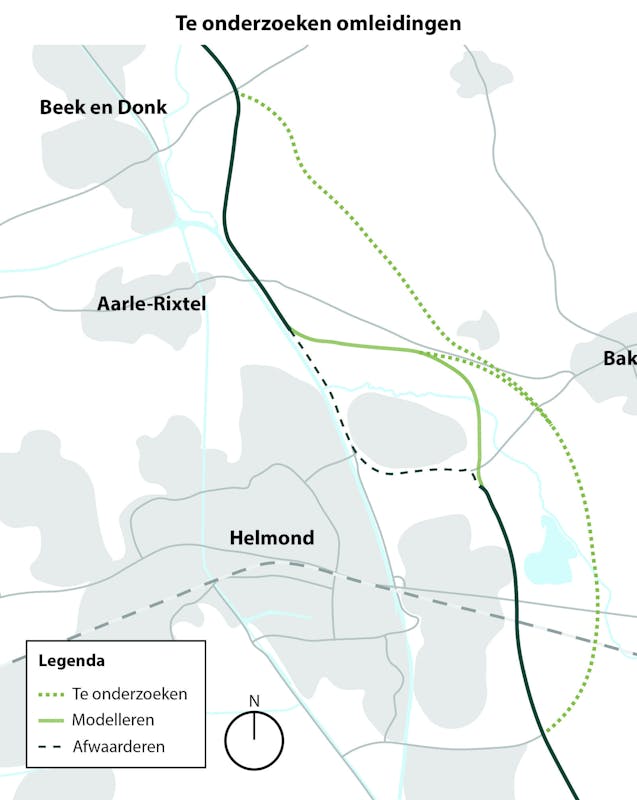 De twee nieuwe varianten voor een omleiding bij Dierdonk lopen vanuit de rotonde bij de Rochadeweg, tussen Helmond en Asten, met een ruime boog om de plas bij Berkendonk heen. Vanuit het stroomgebied van de Aa, de Benthem en Aarle-Rixtelseweg lopen ze vervolgens dwars over woon- natuur- en landbouwgebied en vlak langs de dorpskern van Bakel.