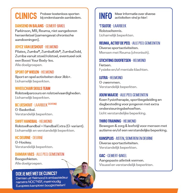 Het programma is laagdrempelig en geschikt voor kinderen, jongeren én volwassenen. Denk aan activiteiten zoals rolstoelhandbal, G-basketbal, G-hockey, rolstoelvaardigheid, boogschieten, dans en duofietsen. Ook zijn er informatiestands van sport- en beweegaanbieders uit de hele Peelregio die laten zien wat er allemaal mogelijk is om in beweging te komen.